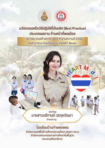 นวัตกรรมหรือวิธีปฏิบัติที่เป็นเลิศ (Best Practice) ประเภทผลงาน ด้านหน้าที่พลเมือง “เยาวชน คนสร้างชาติ ปลูกรากฐานความดี มีวินัย จิตสาธารณะ โดยใช้รูปแบบ HEART Model” |